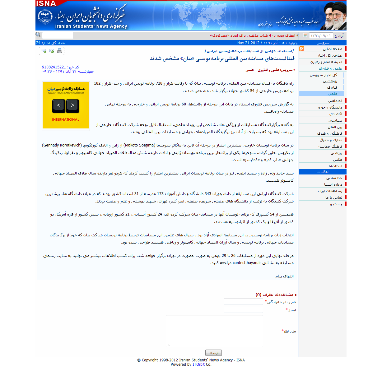 ایسنا: /استقبال جهانی از مسابقات برنامهنویسی ایرانی/ فینالیستهای مسابقه بین المللی برنامه نویسی «بیان» مشخص شدند