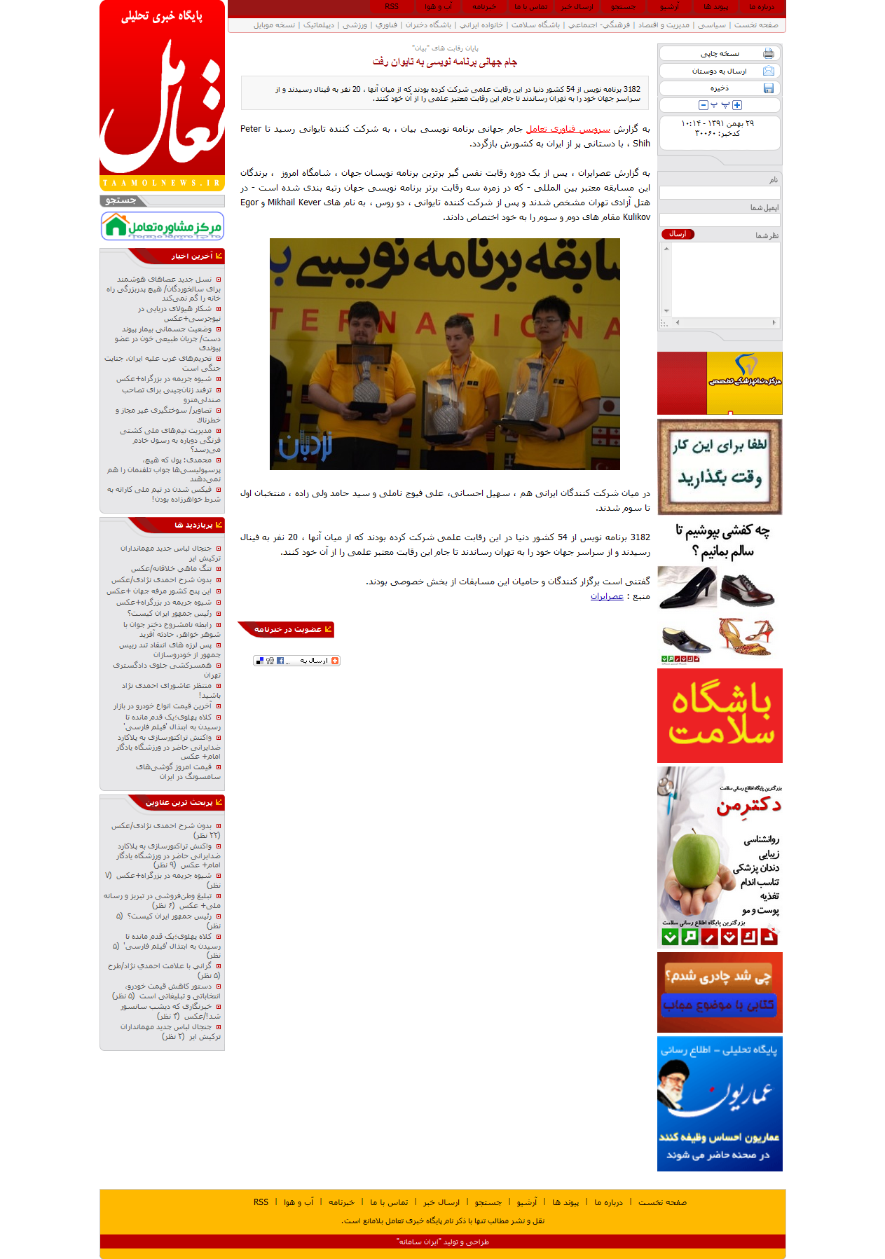 به گزارش عصرایران ، پس از یک دوره رقابت نفس گیر برترین برنامه نویسان جهان ، شامگاه امروز ، برندگان این مسابقه معتبر بین المللی - که در زمره سه رقابت برتر برنامه نویسی جهان رتبه بندی شده است - در هتل آزادی تهران مشخص شدند و پس از شرکت کننده تایوانی ، دو روس ، به نام های Mikhail Kever و Egor Kulikov مقام های دوم و سوم را به خود اختصاص دادند.