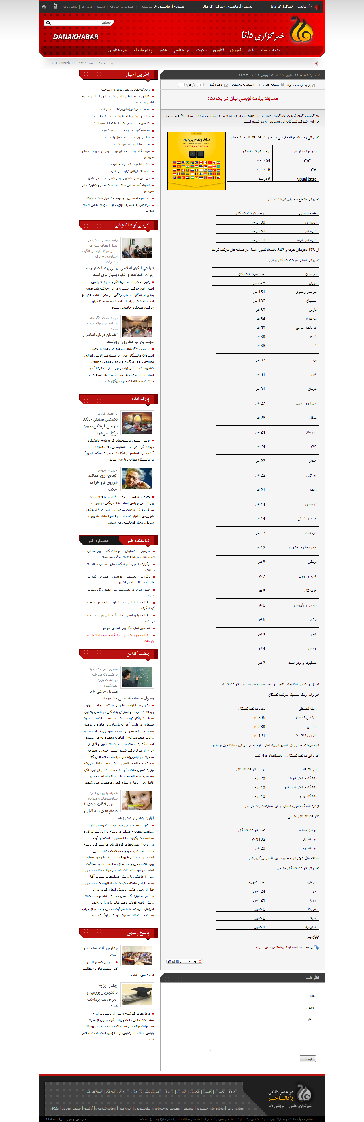 به گزارش گروه فناوری خبرگزاری دانا، در زیر اطلاعاتی از مسابقه برنامه نویسی بیان در سال 91 و بررسی فراوانی شرکتکنندگان این مسابقه آورده شده است.