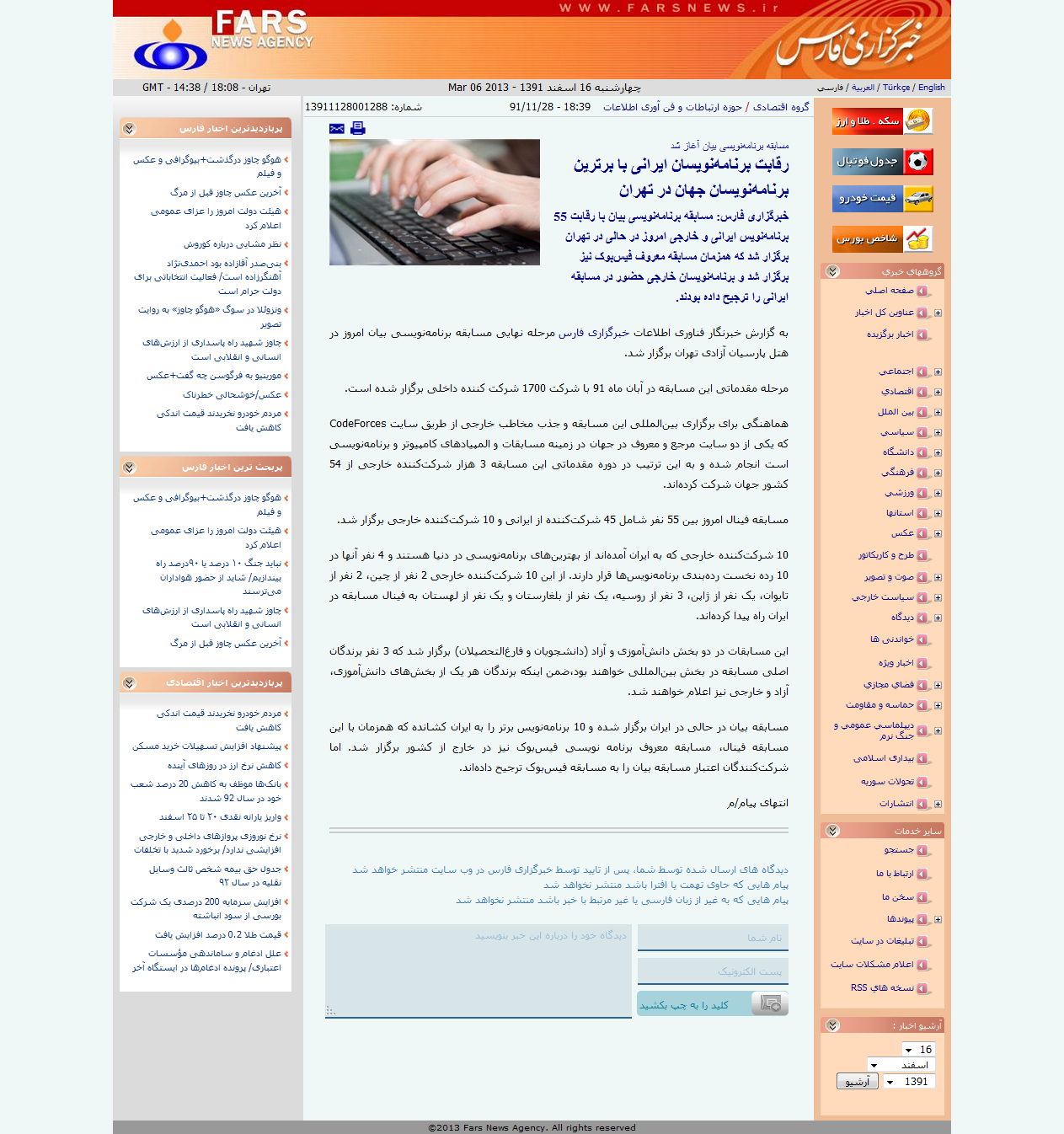 نماینده Codeforces برای نظارت و ارزیابی سطح این مسابقات در دور نهایی در تهران حضور یافت و کل مسابقات نیز به صورت آنلاین از این سایت و چند سایت دیگر فعال در این حوزه گزارش شد.